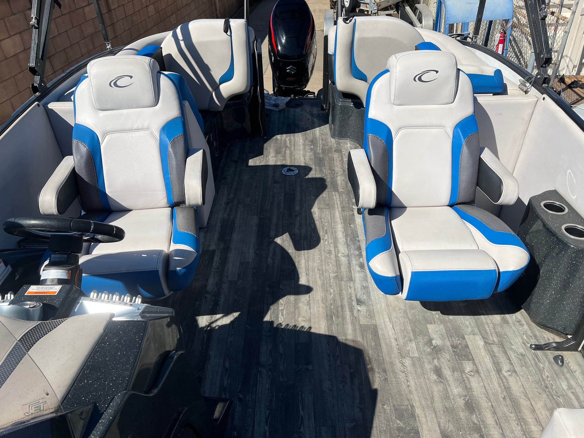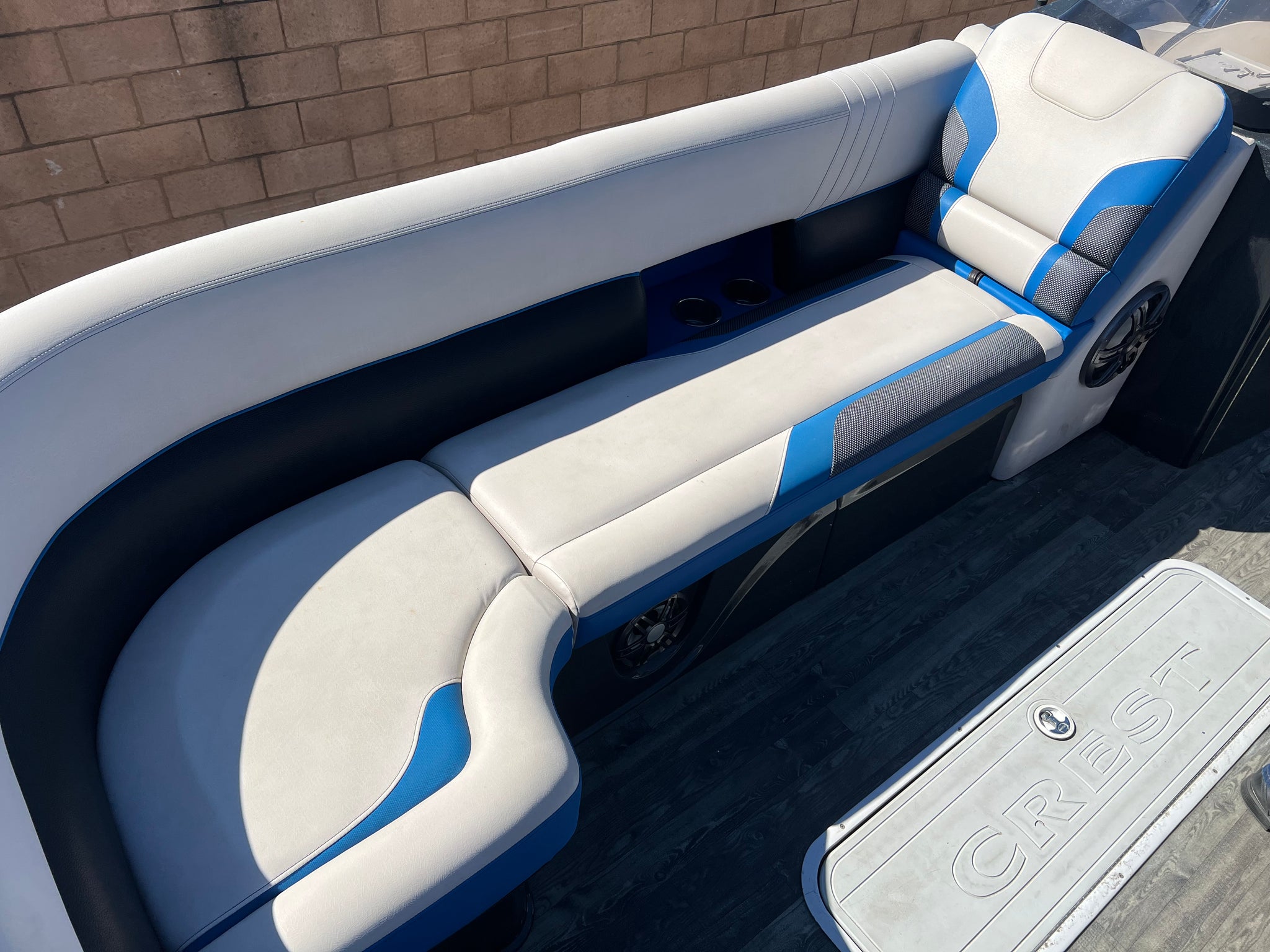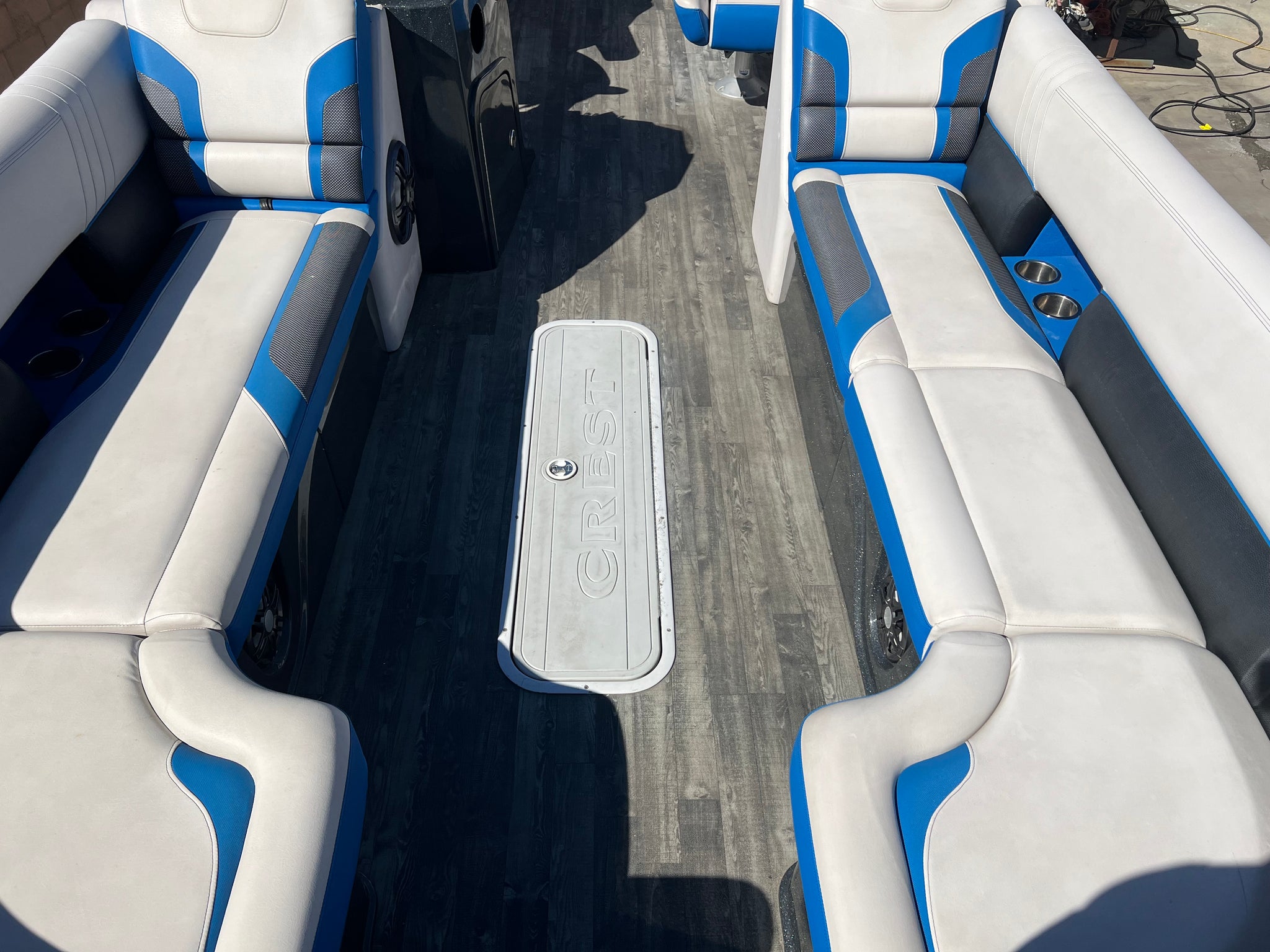 2020 Crest Caribbean (built by MasterCraft) 250 RS Pontoon Tri-toon with 250 hp Suzuki with only 60 hours on it. Huge bimini top, center floor storage, nice sound system, power steering, aluminum underskin, full boat cover, aluminum tandem trailer with disc brakes, roomy layout with comfortable seating, a great buy for a boat this size. Stored inside our warehouse and shown by appointment. Much nicer than a Tracker. Good competition for a Barletta.
